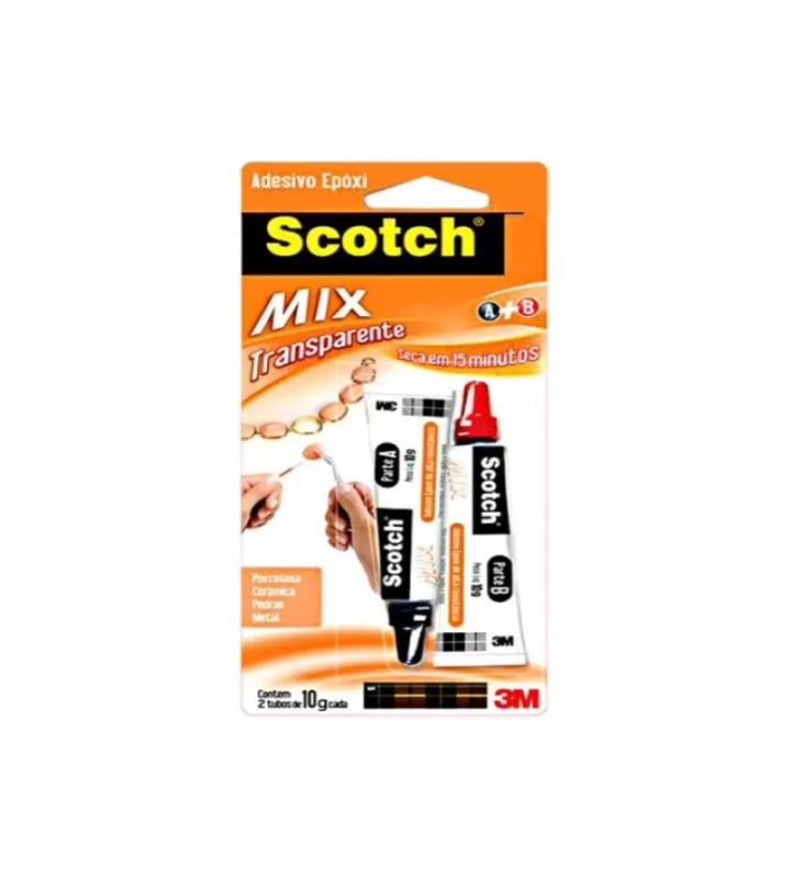 O Adesivo Epóxi 3M Scotch Mix é um adesivo bicomponente que dispensa em partes iguais e é à prova de intempéries. É excelente para colagem de materiais pequenos ou médios, seja em ambientes interiores ou exteriores. Pode ser encontrado em dois tubos de 10 g cada. Como usar: Para utilizá-lo, basta misturar partes iguais dos tubos A e B até conseguir uma cor uniforme. Aplique o adesivo nas duas partes a serem coladas, que devem estar totalmente limpas, isentas de óleos e secas. Junte-as antes de um minuto, pressionando as partes e mantendo-as unidas até o adesivo endurecer. É importante evitar a troca de tampas e limpá-las, assim como o bico, antes de fechar. Aguarde de 12 a 24 horas para obter a máxima adesão. Transparente e discreto, o Adesivo Epóxi 3M Scotch® Mix permite a execução de uma colagem rígida em apenas 15 minutos, de maneira eficiente e em diversos tipos de substratos. É ideal para uso em materiais porosos como porcelana, cerâmica, pedras e metal.
